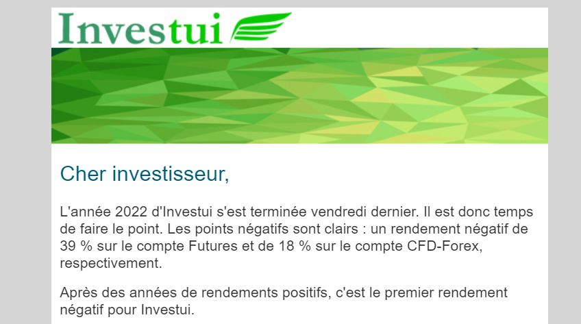 L'année 2022 d'Investui s'est terminée vendredi dernier. Il est donc temps de faire le point. Les points négatifs sont clairs : un rendement négatif de 39 % sur le compte Futures et de 18 % sur le compte CFD-Forex, respectivement.