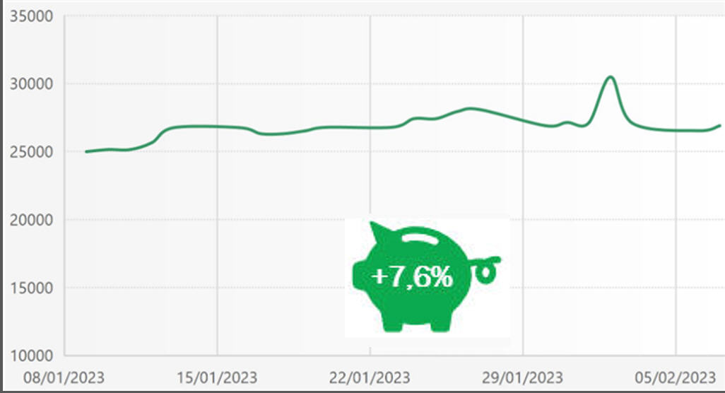 10 trades, dont 70% gagnants plus tard, le rendement net d'Investui après le premier mois de 2023 s'élève à +7,6%, ce qui porte le rendement net depuis 2020 à +21,0%.