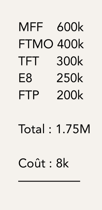 Voici les Prop Firms que j'ai validé pour moi, ma stratégie de conquête et qui coïncident avec mes objectifs perso :