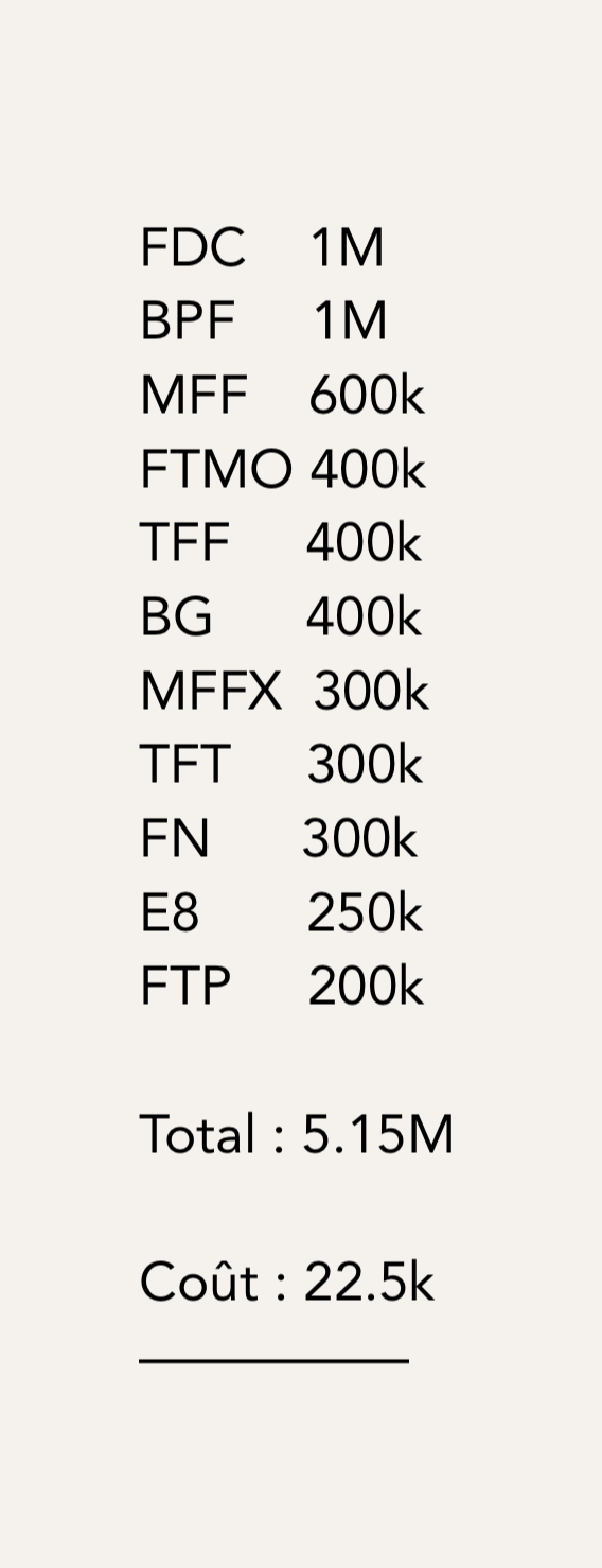 Je parlais sur un discord ou Il y a un trader qui fait que ça avec plusieurs firmes : il prend des positions inverses avec ratio 2/1 mais il faut choisir les firmes qui acceptent l'objectif en un seul trade et/ou peu d'exigence sur le nombre de jours tradés.