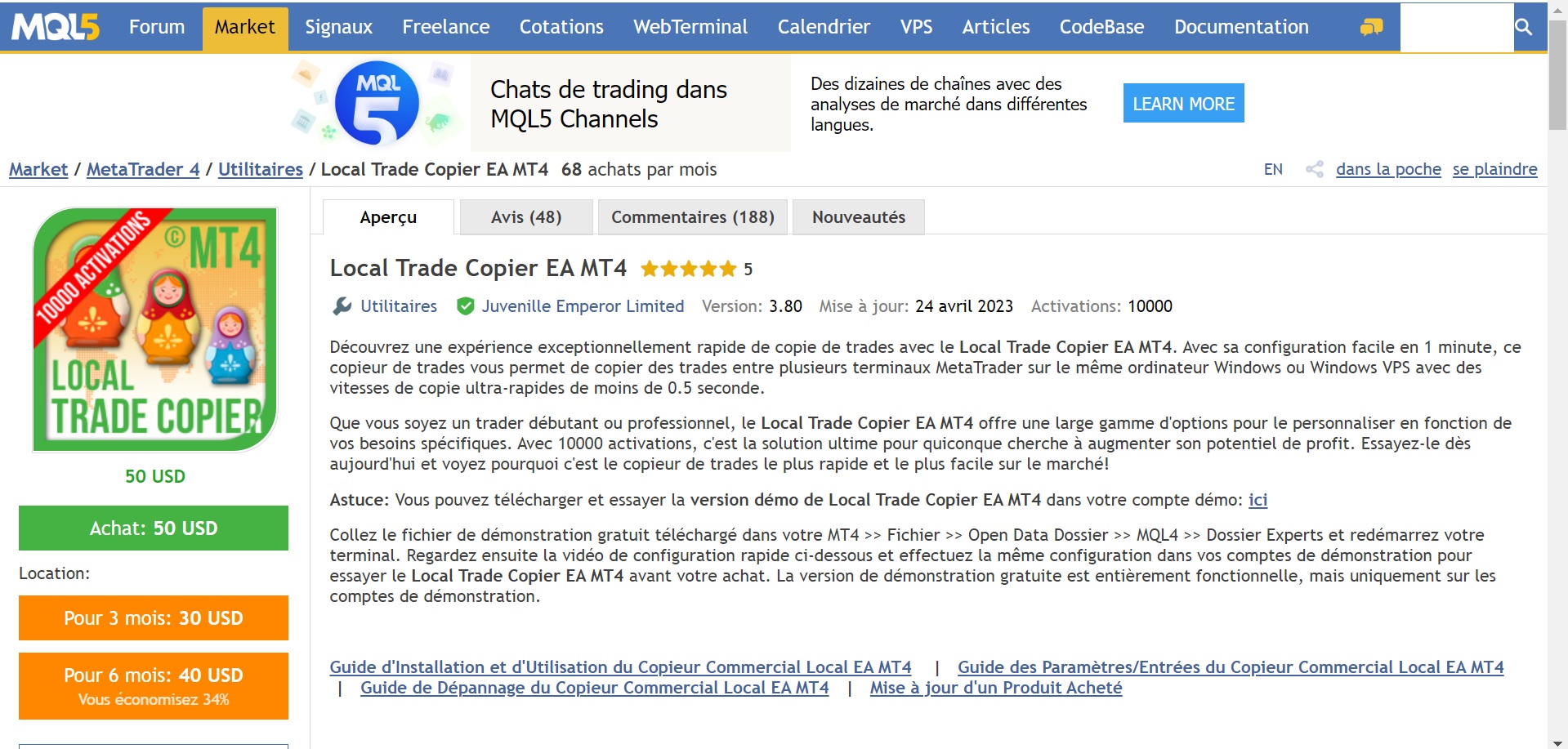 Concernant les copieurs, il y a aussi un copieur "interne", comme celui de FXBlue, qui est trouvable sur le site MQL5.com (le site officiel de Metatrader), payable en une seule fois 50$. Il y a donc aucun abonnement dans celui-là, si on choisit l'option achat :
