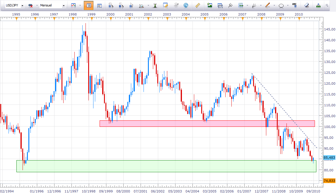 Il ne restait donc que le rôle de valeur refuge à la devise de référence, dont beaucoup d’investisseurs se séparèrent avec le retour de l’appétit du risque ces dernières semaines. Parallèlement à cela, la situation européenne finissait tant bien que mal par se stabiliser, la publication de Bâle III clôturant le débat sur le système financier fragile de notre vieux continent. Nous voilà de nouveau à la croisée des chemins, vers 1.35 USD sur la paire EUR/USD, soit son cours moyen des sept dernières années, raison pour laquelle nous allons prendre du recul en étudiant l’échelle mensuelle.