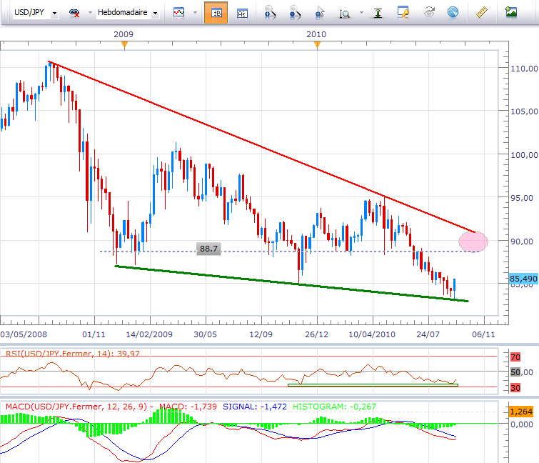 En données hebdomadaires, nous retrouvons le biseau que j'ai publié à de nombreuses reprises dans mes analyses précédentes sur DailyFX France. La borne basse de ce biseau baissier a tenu, la divergence sur le RSI était un des seuls éléments positifs à nous permettre d'anticiper une telle reprise et nous surveillerons désormais le MACD qui pourrait opérer un croisement haussier dans les semaines à venir. Dans cette périodicité, les 88.7 JPY sont en ligne de mire voire les 90 JPY par extension soit le niveau de l'oblique baissière qui coiffe les cours depuis près d'un an.