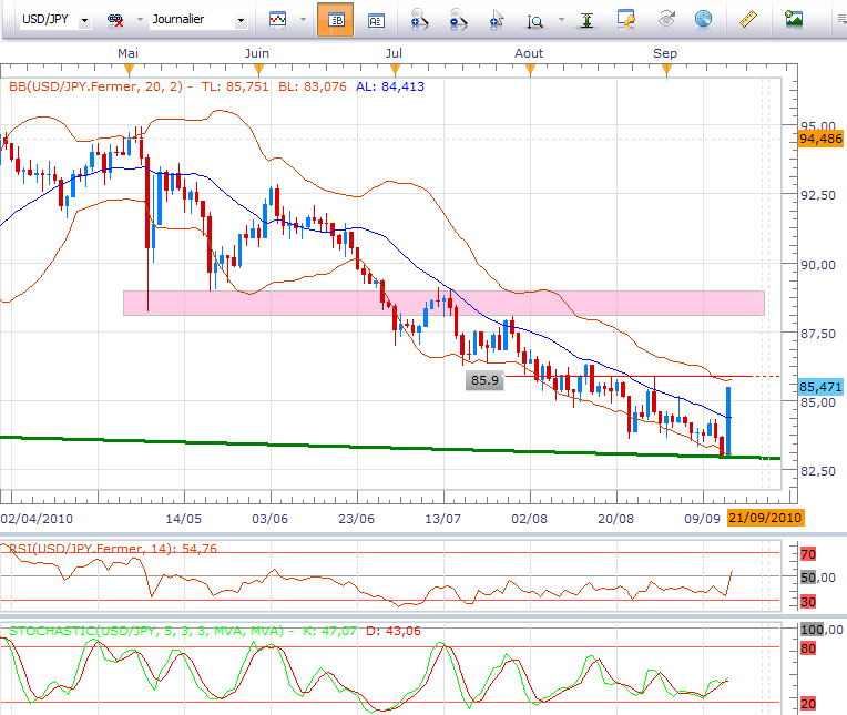 A plus court terme, l'impulsion a été donnée sur la borne basse du biseau et la bollinger basse. La bollinger haute conjuguée a un niveau horizontal à 85.9 JPY constitue le prochain objectif. Au-dessus de ce niveau, la fourchette 88/89 JPY serait en ligne de mire soit un potentiel haussier attractif. En tout état de cause, les acheteurs remonteront leurs stops de protection et se laisseront porter. Tout repli en direction des 85 voire 84.5 JPY soit la moyenne mobile à 20 séance sera exploité pour prendre le train en marche. Je déconseille aux vendeurs de se mettre en face d'un tel mouvement.