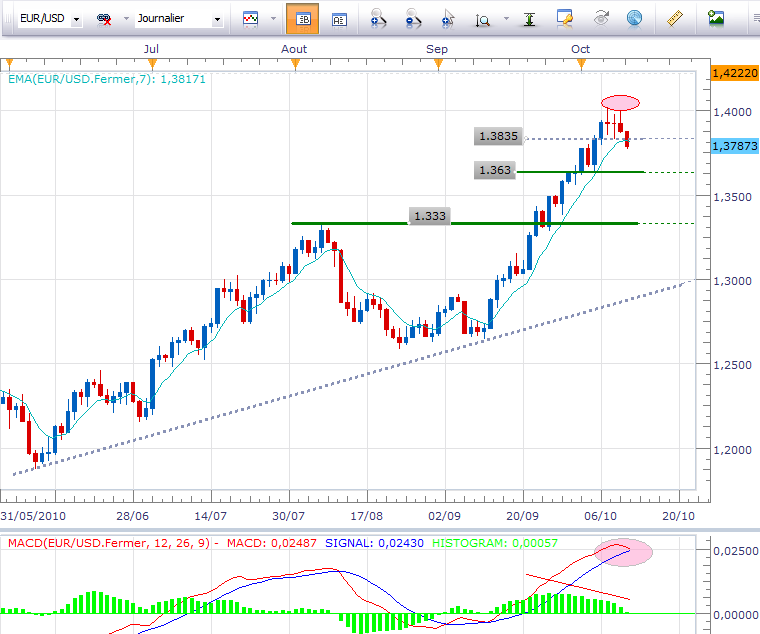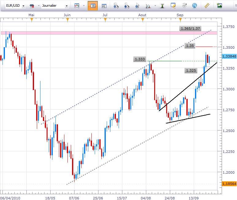 Dans l’analyse de jeudi dernier « Point haut atteint » alors que l’EUR/USD avait touché 1.4024 USD, je parlais bien d’un point haut potentiel de court terme. En effet, tant que les 1.33 USD supporteront les cours, la dynamique de moyen/long terme initiée depuis les 1.26 voire les plus bas de juin, ne sera pas remise en question. Le but de ce titre évocateur était tout simplement de mettre les investisseurs à l’achat en garde contre l’euphorie ambiante. Il s’avère que le marché n’a pas l’habitude de suivre le consensus et qu’avec 90% de vendeurs sur le Dollar, la situation n’était pas tenable.