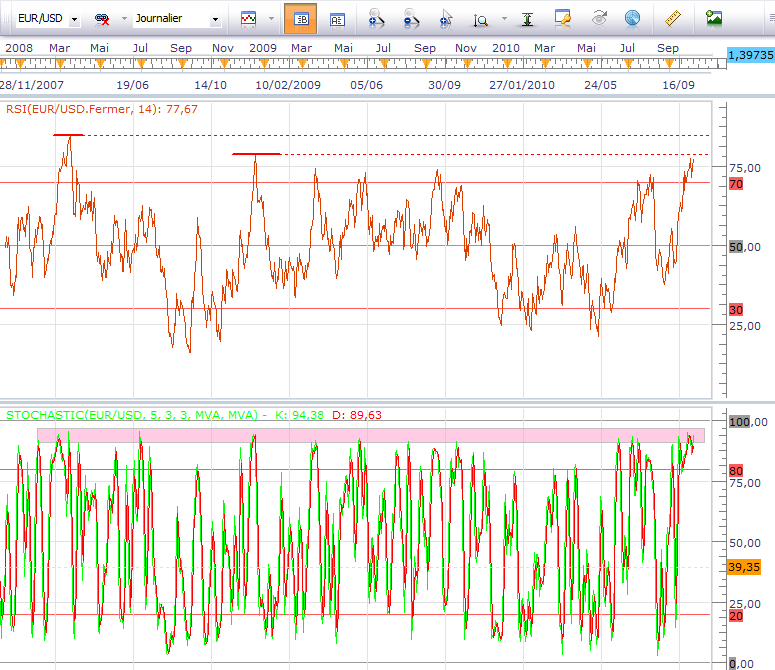 Les indicateurs techniques de base comme la stochastique ou le RSI résultent des prix et un RSI supérieur à 70 ne doit en rien vous entraîner à la vente par précipitation de trouver le point haut. Ce qu’il est intéressant de constater en étudiant ces indicateurs sur les trois dernières années, c’est qu’ils évoluent actuellement à des niveaux particulièrement élevés. Une ultime poussée haussière pourrait encore avoir lieu car les extrêmes de mars 2008 n’ont pas été atteints, certes, mais le timing actuel vaut le coup de tenter des ou tout du moins pour les acheteurs encore en position, de concrétiser des plus values et/ou resserrer les stops.