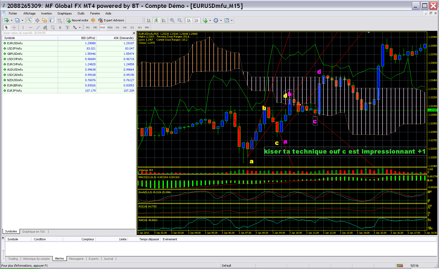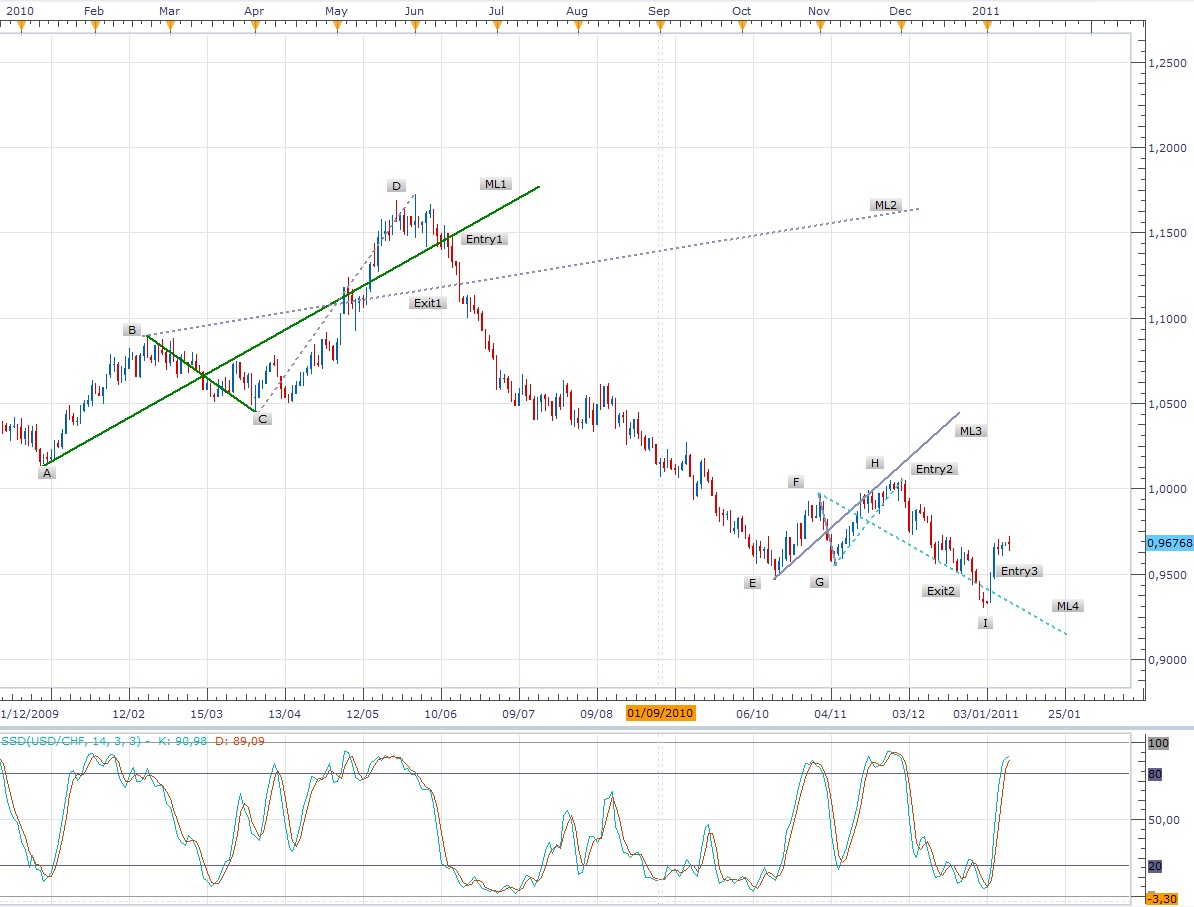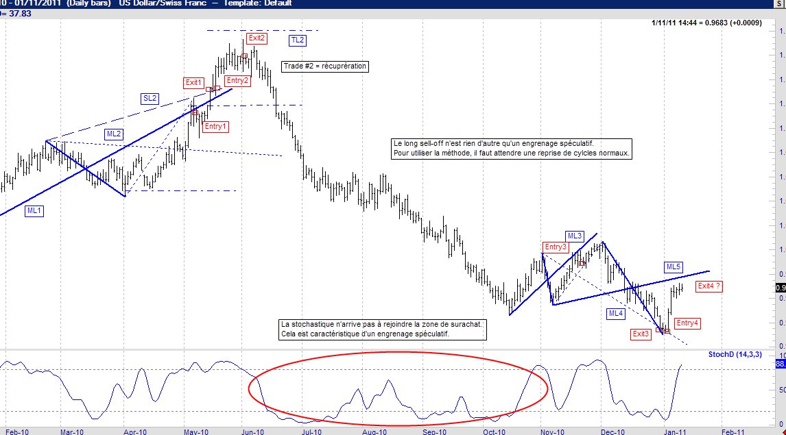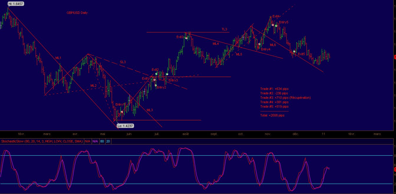 Les points d'entrées sont assez facilement repérable, avec l'aide du stochastic construire les ML est à la portée de tous. Par contre, là ou je peine toujours c'est pour tenir la position. J'aurais facilement pu multiplier mon P&L par 1.75 si j'avais tenu mes trade jusqu'au bout. J'ai toujours l'habitude de sortir dés qu'il y a un retracement du cours sur un support/résistance (peur de voir mes gains fondre).