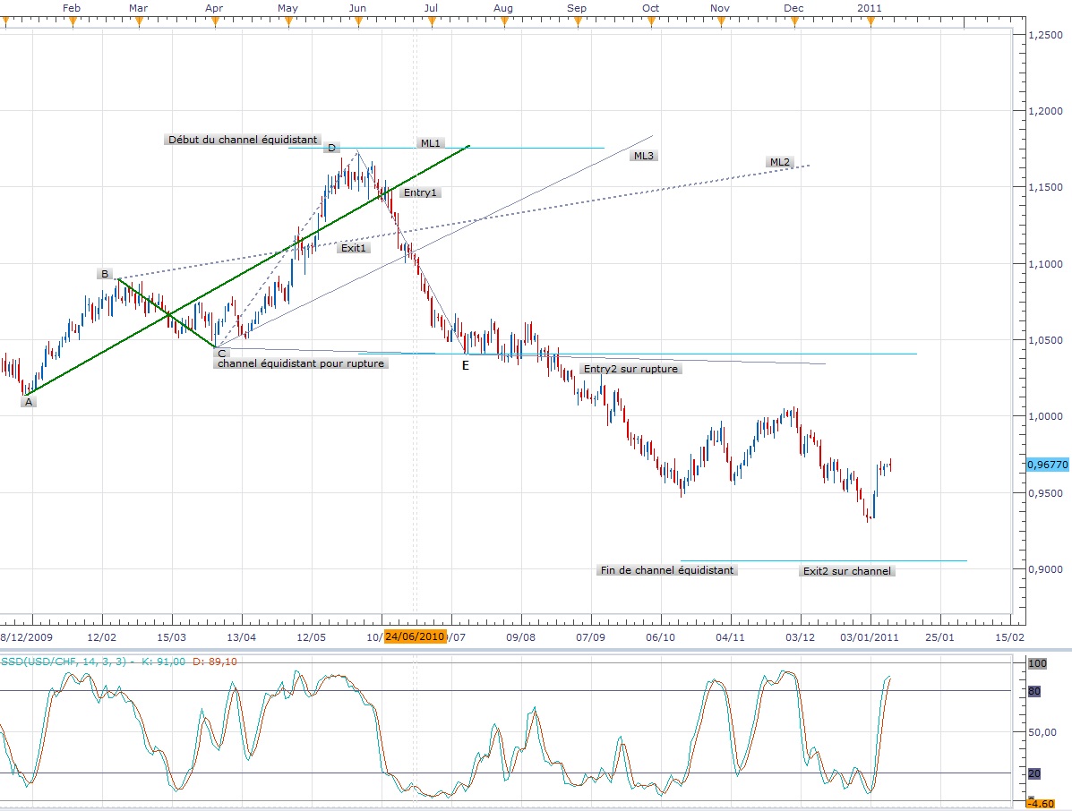 J'attends que le cours remonte sur la ML3 ce qui ne se produit pas. J'ai une rupture qui apparaît. J'entre dans le marche sur Entry2 et j'attends la sortie sur la "fin de channel équidistant". Exit2 espéré aux environs de 0.9050.