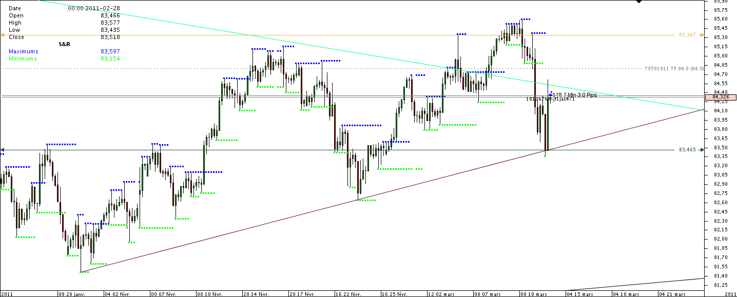 bon j'ai pris position sur cad/jpy. je vise les 84.80. trade un peu risqué vu les circonstances. cependant la parité a rebondi sur son oblique haussiere et nous pouvons voir un avalement haussier. la parité n'a pas encore verifier la cassure des 84.90. donc je vise un retour dessus. je pense que malgré l'injection de liquidité faite par la BOJ ca ne devrait pas etre suffisant pour empécher le yen de se déprécier meme si les fonds de secours sont toujours actif.