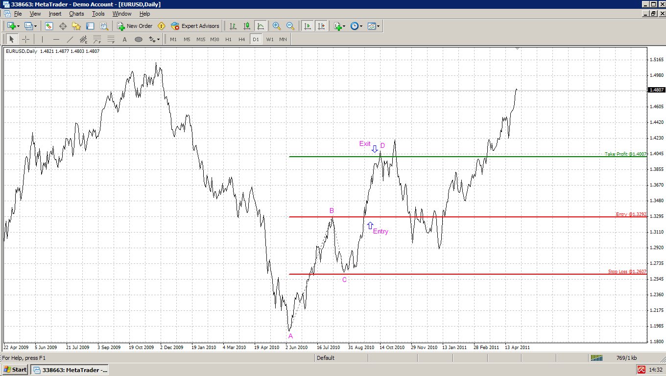 Pour effectuer un trade avec le système, il faut avoir un premier swing (ici A-B) et une correction (ici B-C). Une fois ces deux éléments repérés, nous pouvons placer notre "entry", notre "stop loss" et notre "take profit". Notre "entry" sera fera par un "break" du sommet du swing (ici A). Notre "stop loss" sera placé juste au-dessous du niveau équivalent à la moitié du swing (ici 50% de A-B). Notre "take profit" sera placé au niveau équivalent à une expansion équivalente au swing précédent (ici D où C-D = A-B). Voilà pour l'utilisation du système.