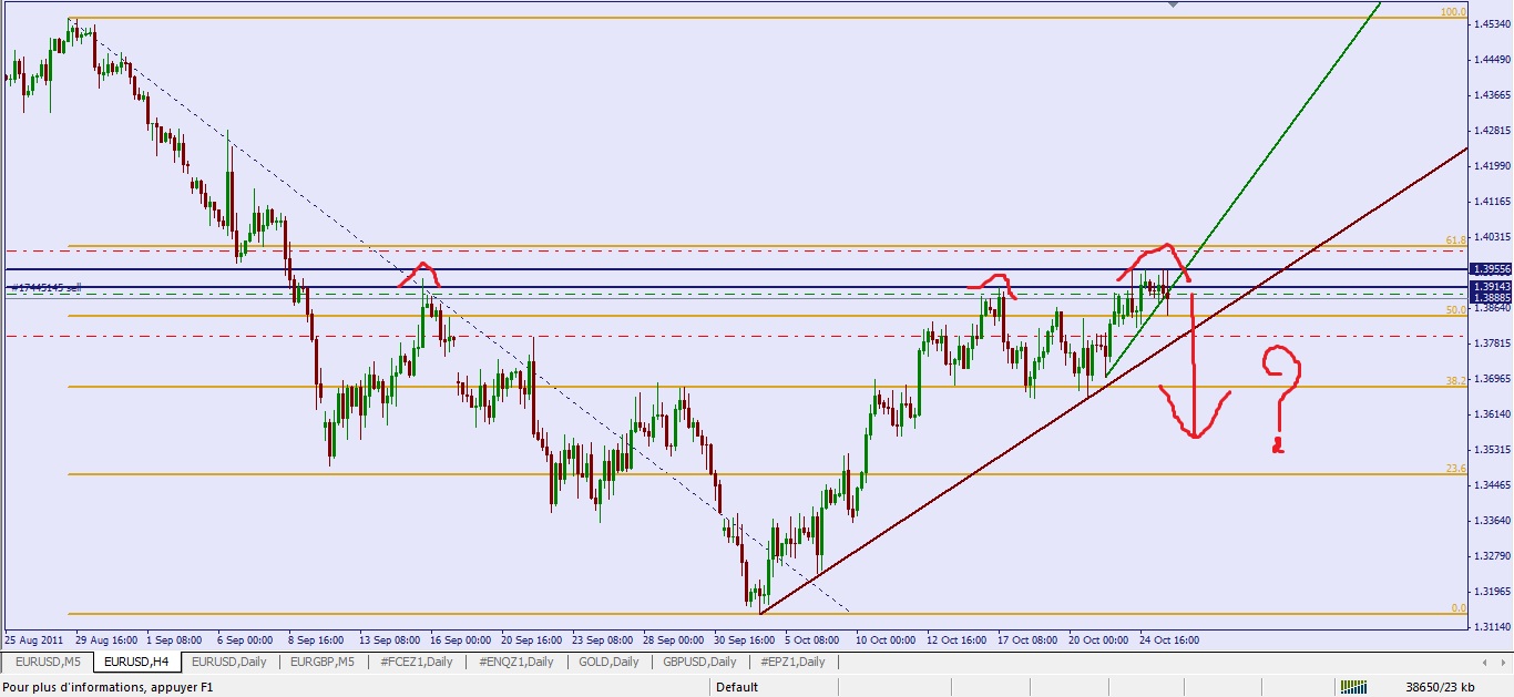 Pour entrer short sur eur/usd, j'attendrais une rupture du support oblique en H4 cad une rupture des 1.3850 voire des 1.3820.