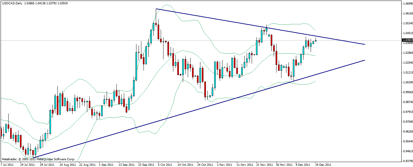 L'USD/CAD me semble s'inscrire dans une tendance haussière en journalier avec des plus bas de plus en plus hauts. En revanche on peut noter des plus hauts de plus en plus bas qui plaident pour une compression des cours (triangle d'indécision).