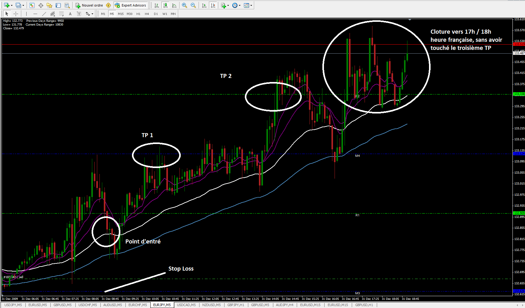 - Prise de position à l'achat avec stop loss sous le Point Pivot (ou le M2 si on est très proche du Point Pivot et selon les plans de Money Management adoptés).