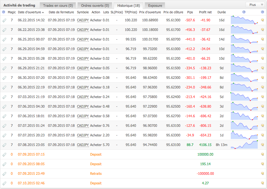 Donc lors de mon inspection matinale, je constate que sur la paire CADJPY a accumulé 10.33 lots ouverts sur buy, et que le flottant du compte est supérieur à 10 k.
