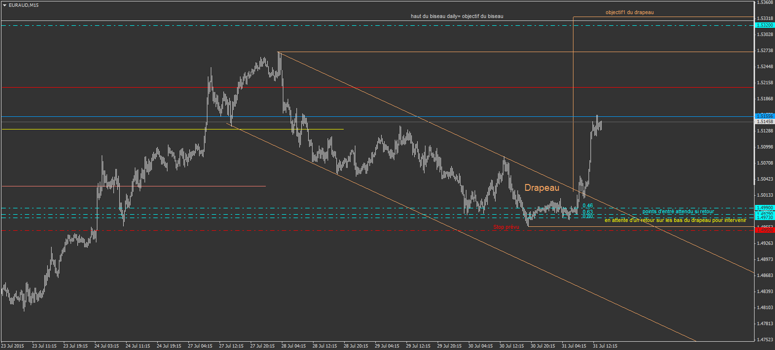 sur les deux courbes, le drapeau a été cassé. j'attend un retour sur les bas du drapeau pour intervenir avec le plus petit stop possible. le stop sera serré sous le drapeau.