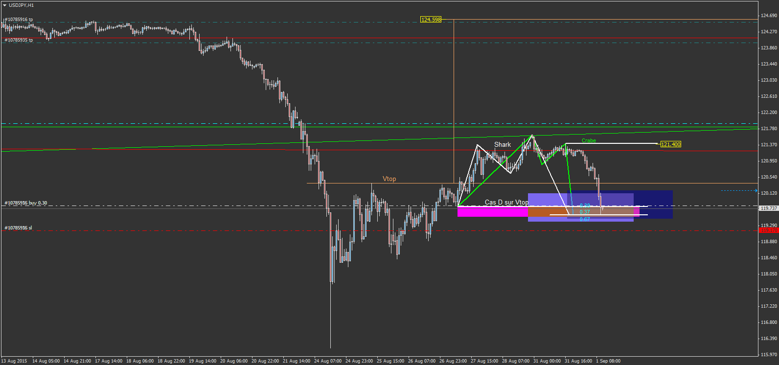 sur le pullback on rentre sous la ligne du coup marron du Vtop et on atteint la zone rose qui est la zone où les stops sont récupéré. selon ma technique une figure harmonic permet de venir dans cette zone de stop. l'harmonic ici est soit un crabe, soit un crabe. dans les deux cas, les zone d'intervention ce situe dans la même zone et corresponde à la zone des stops piégé en rose.