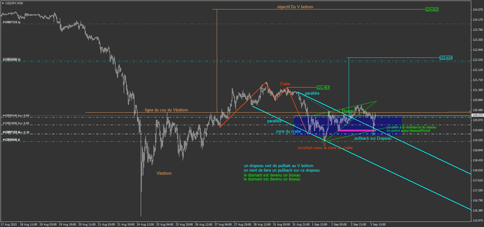 sur l'usdjpy j'ai donc repéré un drapeau bleu cassé, et un diamant. qui viennent dans le sens de mon crabe. l'incursion sous la zone du crabe m'a stoppé, mais j'ai tout de suite ré intervenue.