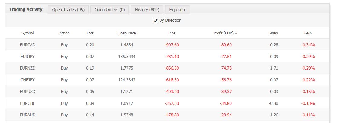 Et hier, je vois des exposures de paires avec +90 euros de gains non clôturées. Tout simplement parce que par paires il y avait des ordres ouverts avec différents magic number et que l'EA trie par symboles ET par magicnumber.