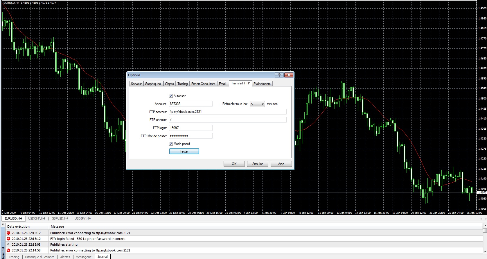 J'ai bien ouvert un compte sur MyFxBook et ajouté un portefeuille, cependant quand je rentre les informations (que je pense pourtant exactes car je les ai vérifié à plusieurs reprises), j'ai le message d'erreur de publication qui apparaît dans le journal de MetaTrader.
