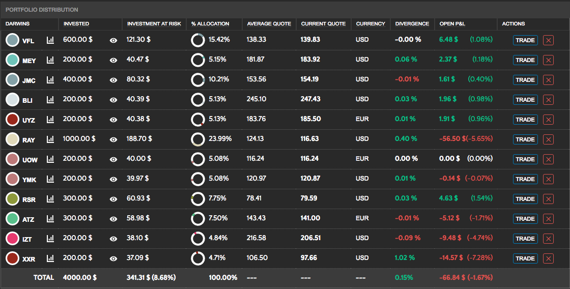 Par contre, globalement je suis légèrement en gain sur ce Darwin. ($ + 8.04)