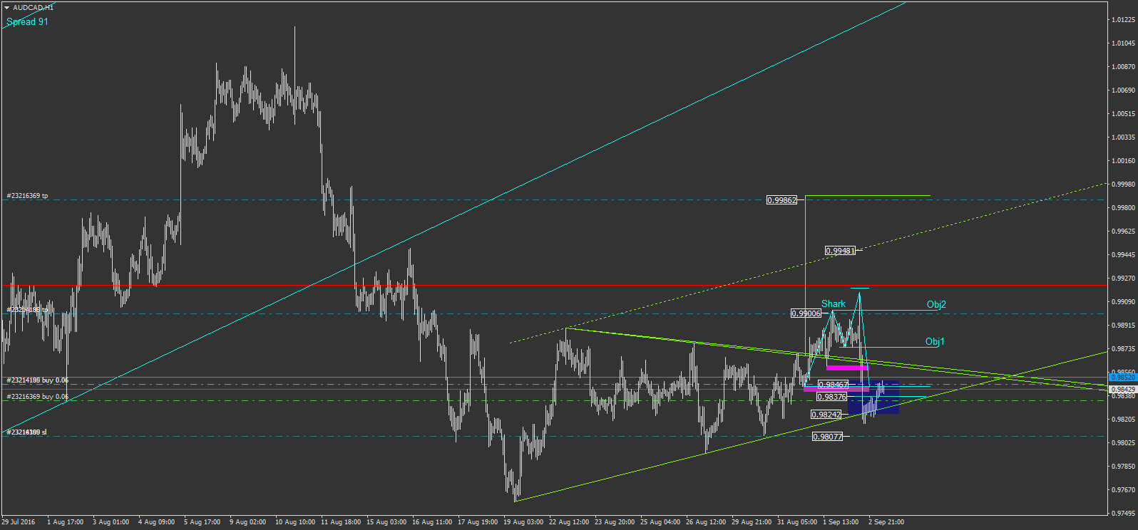 je suis rentré sur l'audcad. on y trouve en H1, un triangle en vert où, après cassure, on revient sur le triangle, et on est même rerentré dans le triangle pour revenir toucher son support. c'est un pullback très généreux. du cou, je suis rentré à l'achat, guidé par une shark servant de pullback. on est allé sur le bas de zone de la shark (bas du carré bleu). j'ai 3X0.06lots . j'ai prévu de décharger 2x0.06 lots sur l'objectif2, c'est à dire l'objectif de la shark bleu. je garderais mon dernier 0.06 lots pour l'objectif du triangle j'ai comme stop 16+16+11=44€ et donc pour objectif: 22+22+62=106€. à l'objectif 2 je récupèrerais donc 44€, et garderais le lots ou le stop est à 11€(le plus bas des achats), mais je ne risquerais plus rien à ce moment là, car j'aurai le breakeven (stop mis gagnant sur le prix d'entrée, voir gagnant). j'ai prévu de faire le breakeven une fois qu'on sera revenu au dessus du triangle(si on y revient lol) et qu'on aurra touché le niveau de l'obj1. quel est votre point de vu ou analyse sur ce AUDCAD?