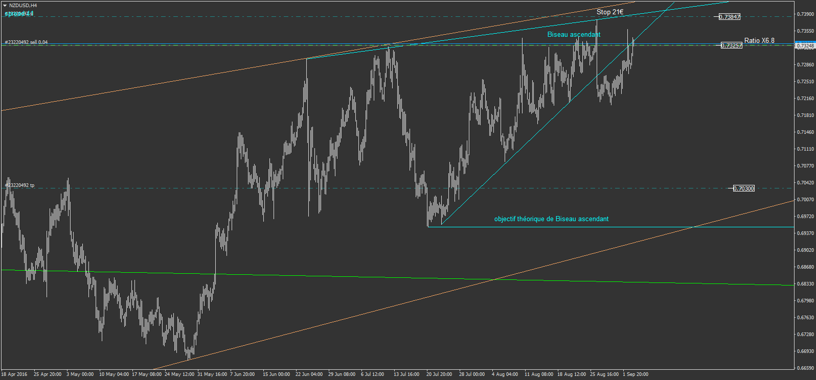 sur le nzdusd, je suis à la baisse. y a un biseau ascendant qui a cassé à la baisse et on y fait un retour sur le biseau après cassure. j'en profit, car y a un bon ratio de plus de X5. je risque 21€ pour en gagner 130€ sur l'objectif théorique du biseau, c'est à dire son plus bas. j'ai écourté mon objectif à 100€ par rapport à l'objectif théorique (0.70300 comme objectif) . je ferrais le breakeven une fois le bas du pullback dépassé à la baisse. bon, voila, on verra bien le résultat, à plus