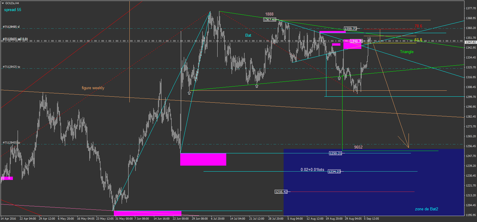 le triangle vert à attiré mon attention. car on est revenu dedans après une cassure, et on est revenu au dessus de la rotation partielle d'avant la cassure, dans mon carré rose. j'ai mis un fibonacci de tout en haut à en bas (ligne rouge pointillé) pour vendre au dessus ou sur les 61.8% avec un stop à 78.6%. le stop est au dessus de la résistance du triangle et le gros objectif c'est l'objectif du triangle vert. j'ai mis 0.03 lots répartie en 0.01 + 0.02 lots. je prendrais un petit objectif intermédiaire proche du support du triangle où je fermerais 0.01 lots. je peux aussi tout prendre à l'objectif du triangle, et là le ratio est pas loin du X8. on verra, y a qu'à attendre donc...