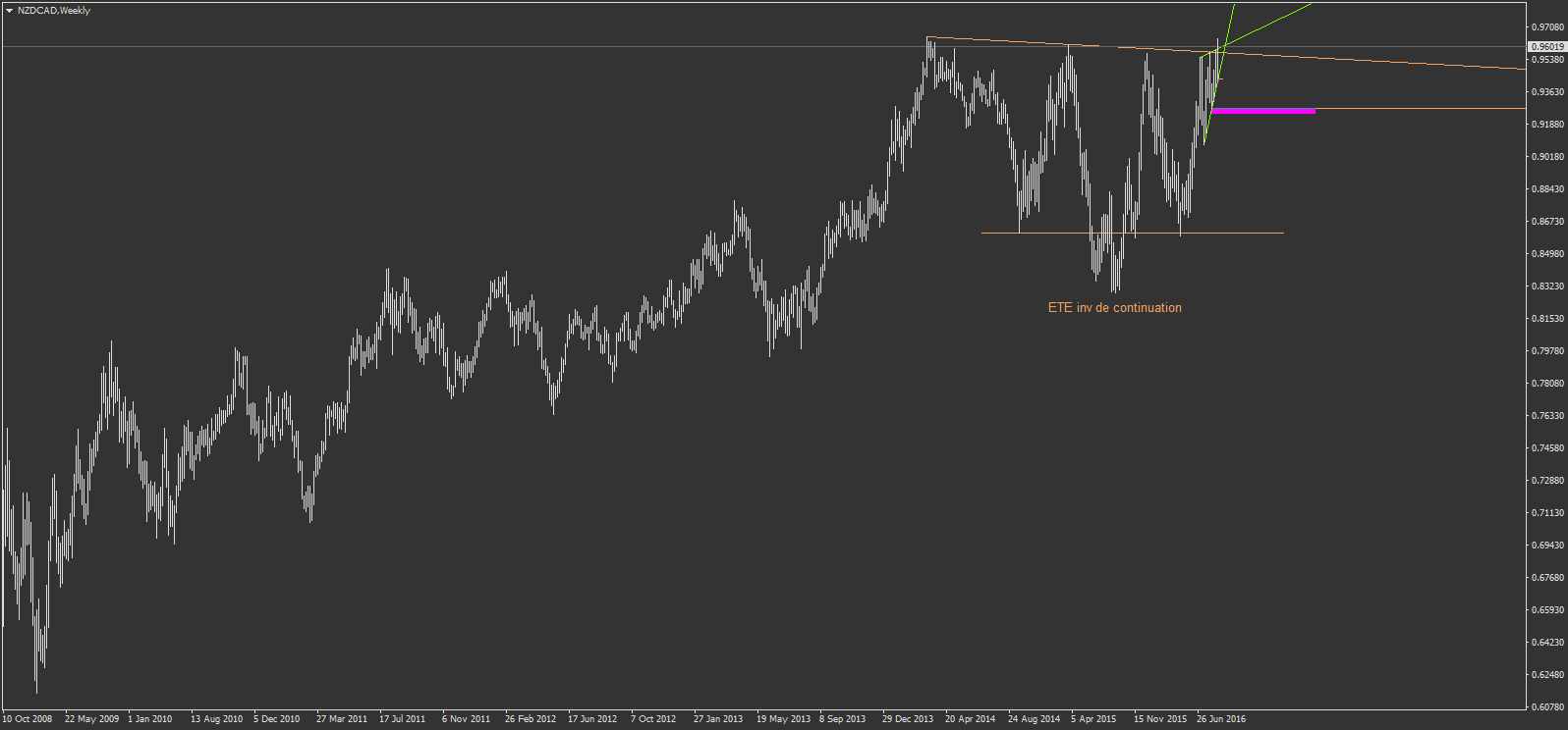 ce qui m'embête, c'est qu'il y a cette ligne marron pointillé qui sert de support, et si on casse la résistance verte à 3 point, ca forme alors un Biseau descendant à objectif haussier.
