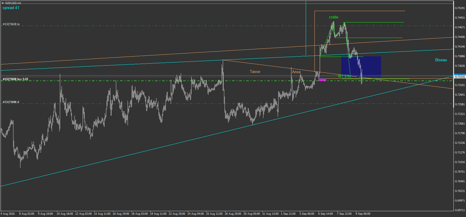 NZDUSD un biseau ascendant cassé à la hausse, fait un pullback généreux. je tente en bas de zone d'un crabe stop sous le support du biseau, et sous la anse d'une tasse avec anse qui attend toujours son objectif