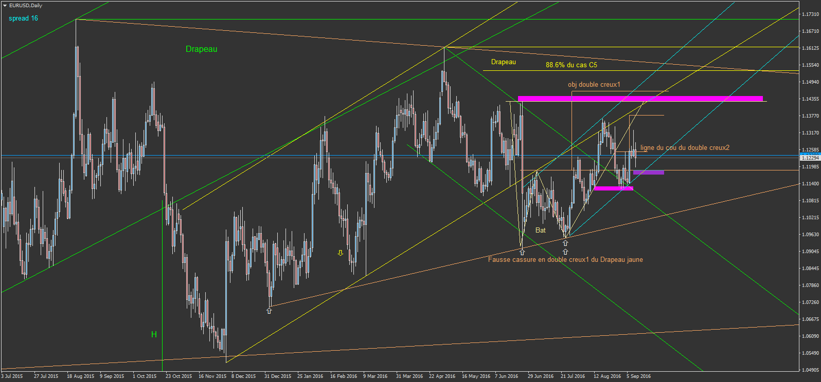 salut à tous. l'eurusd, j'ai mon cas C1. suite à la cassure d'un double creux, on redescend brutalement dans une zone comprise entre les 50% et les 61.8% de la hauteur du double creux. cette zone est la zone d'achat de mon cas C1. avec un stop à 78.6% de ce même fibonaci. j'ai fait cette constatation et je trouve le ratio gain perte interessant, donc je l'utilise. sur l'image, il y a en daily un premier cas C1. puis un deuxième probable en court, mais où on a pas encore atteint la zone mauve en question.