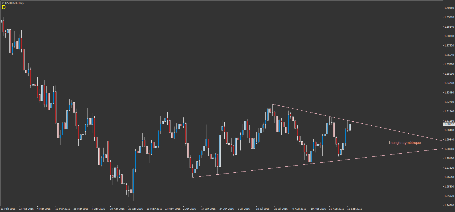 Sur USDCAD, voici un triangle symétrique. mais il doit cassé plutôt à la fin du triangle (plutôt du coté de la pointe du triangle, autour ou après les 70% du triangle). Je vais donc encore attendre une cassure bien visible et bien situé, puis attendre encore le pullback pour agir seulement si mes critère y sont. je dois donc m'armer de patience encore une fois...