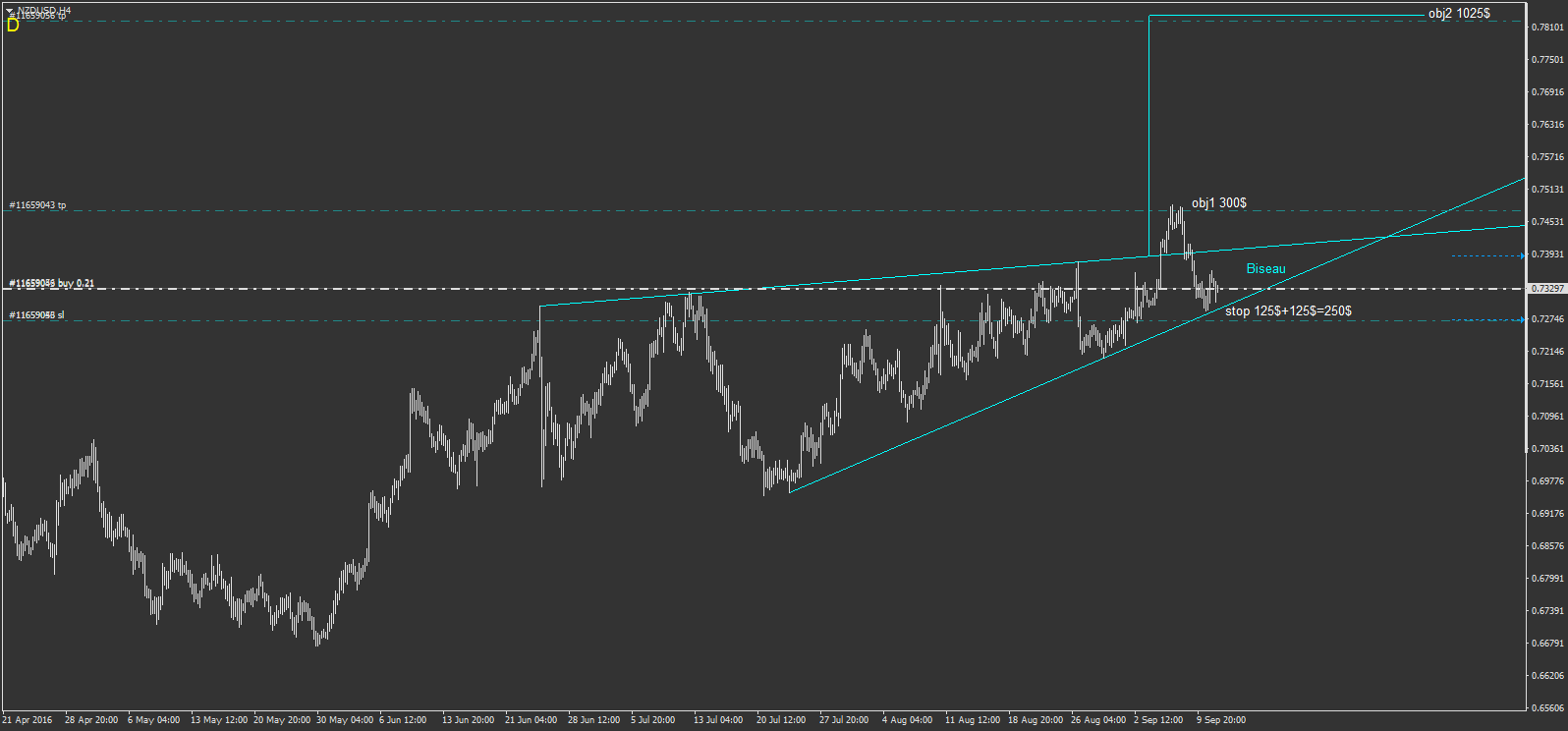 NZDUSD à l'achat sur un biseau qui avait cassé à la hausse, mais on est rerentré dans le biseau quasi jusqu'au support. je pense toujours à la hausse, mais il y a le risque de cassé à la baisse maintenant, c'est pour ca que mon stop est sous le support bleu.