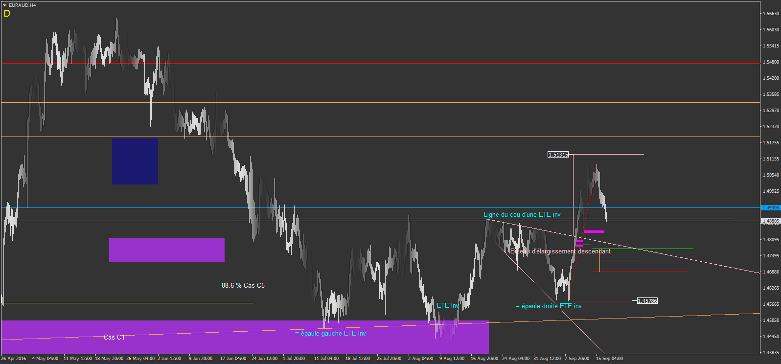 sur l'EURAUD il y a une épaule tête épaule inversée (ETE inv) en H4.