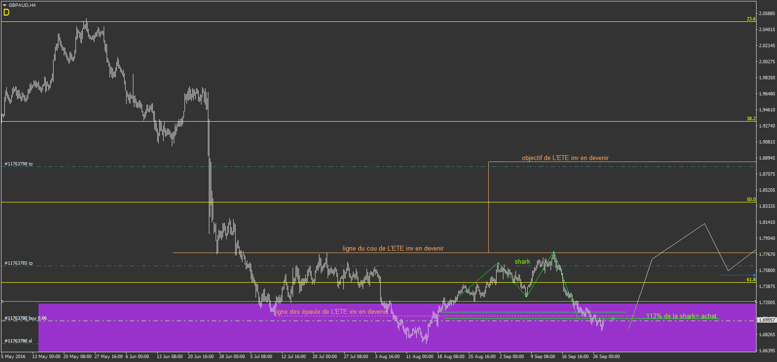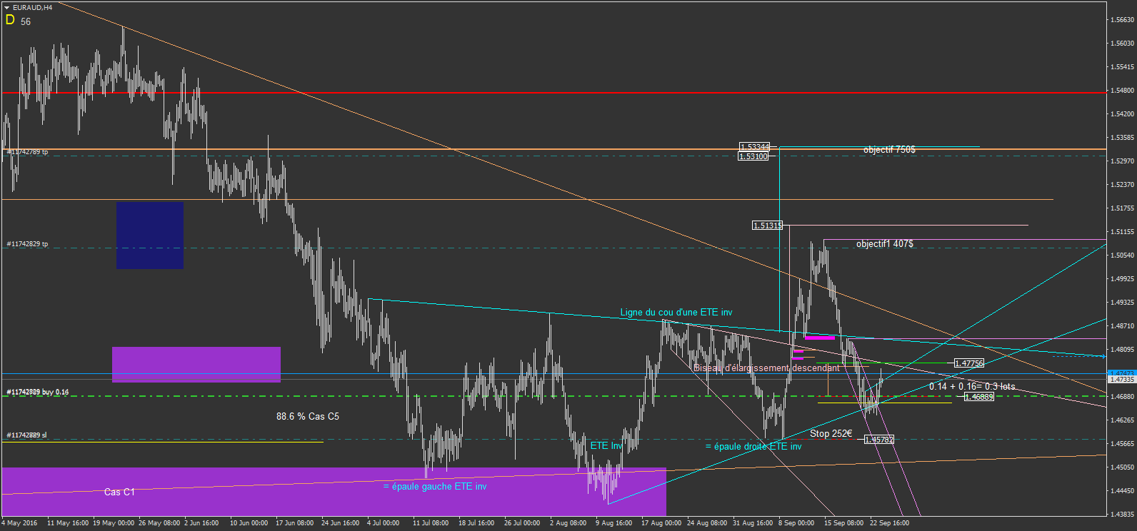 en faite, sur les 36 pages, c'est tout le cheminement depuis mes débuts, mais je n'ai pas tous poster non plus. il y a toutes mes interrogation depuis mes débuts, et les évolutions , les interrogation avec d'autre intervenant du forum, et du coup pleins d'idée mélangé, avant d'en arrivé à mes méthode de seulement maintenant lol. ca fait une belle aventure d'apprentissage. mais comme je le dis toujours, ne copier pas mes trade, je les poste car ca fais partie de mon travail de rigueur de mon trading, ca me force à être carré lol.je me vois mal reprendre toutes les page pour récupérer les trades vu que de toute façon y a un mélange de technique, surtout au début, même si la base reste le chartisme, on a ,avec d'autre, appris le chartisme, les figures harmonics, et j'en ai fait un mélange pour en extrapoler 16 Cas d'intervention ou d'analyse autour de 16 types de figure chartiste et de 7 figures harmonics. le tous me permettant de faire soit des cas d'intervention, soit des cas utilisé comme guide d'analyse avant les cas d'intervention. du coup en reprenant la file, serait long et inutile ...phi1618 a écrit :Après 36 pages, je pense qu'il fallait créer une liste des trades postés (gagnés et perdus) pour éventuellement savoir si cette stratégie chartiste porte réellement ses fruits.