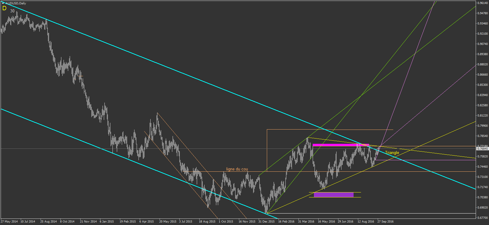 je voit sur aud usd un triangle jaune en daily, et on est proche de ca résistance. et en periodicité 15min (M15), on y voit un biseau en cour de formation. comme on a pas tout à fait touché le haut du triangle, je n'anticiperais pas la baisse pour l'objectif du bas du biseau. de plus on peut aussi cassé le biseau par le haut et remonter en cassant aussi le triangle jaune. j'imagine aussi la possibilité d'une fausse cassure du biseau par le haut, juste pour prendre appuis sur la résistance jaune du triangle jaune, avant de redescendre sur l'objectif du bas du biseau. mais pour l'instant on peut tout imaginer!!!!