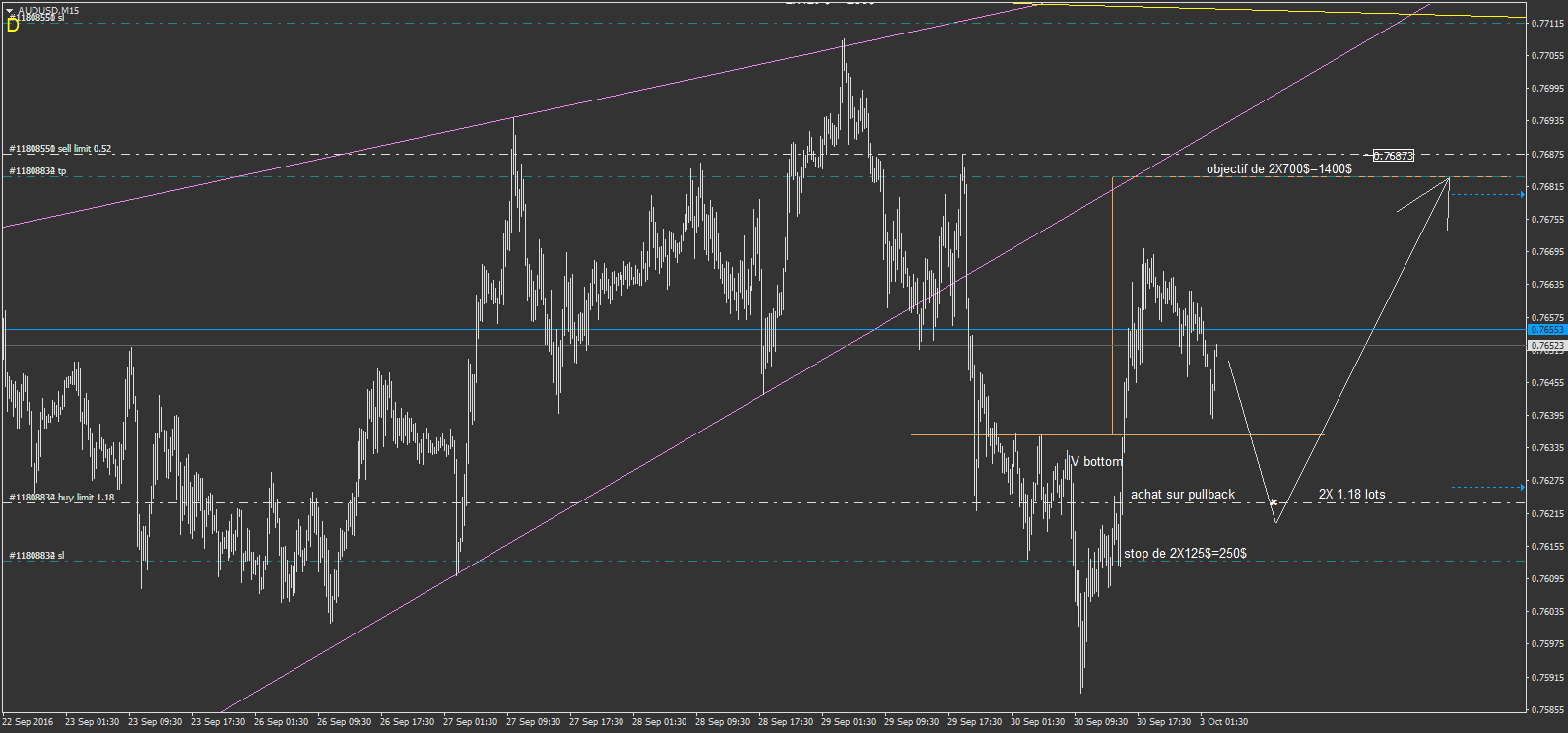sur AUDUSD, j'ai parlé d'un biseau que je veux tenter à la baisse si on remonte. et bien avant , pour remonter, il y a en bas un V bottom bien net. j'ai prévu une intervention si on redescend me prendre avant de toucher l'objectif. si on fait l'objectif avant, j'enlèverais l'ordre différé de 2X1.18 lots