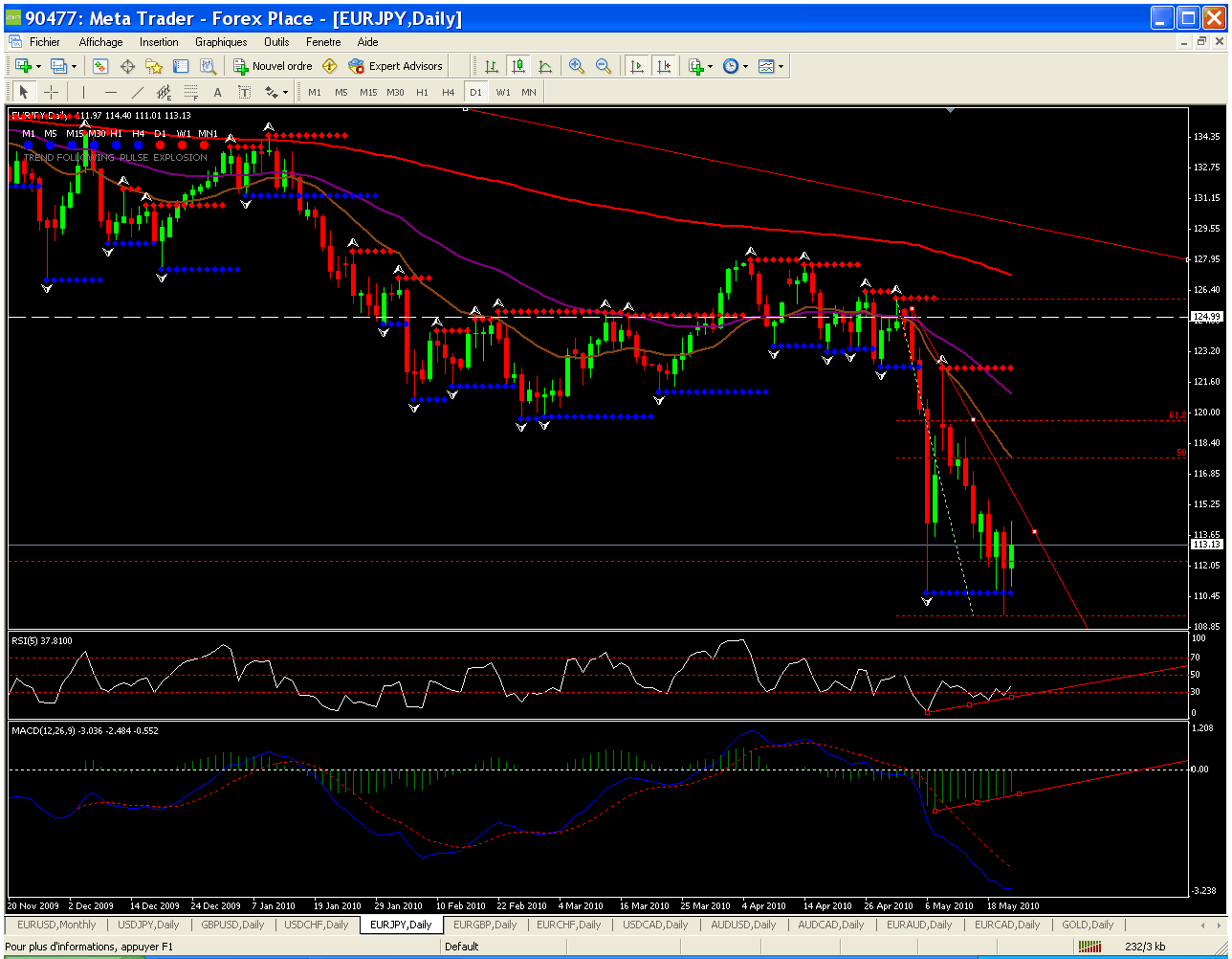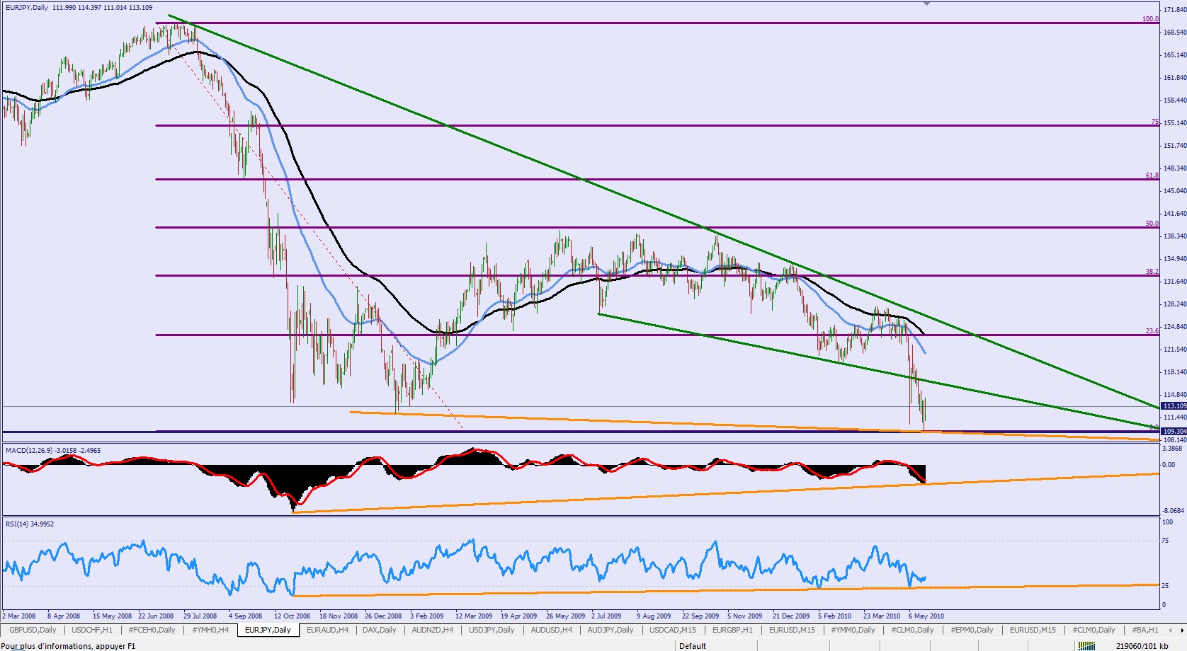 La parité après avoir cassé le support des 122.34 a connue une accélération baissiere , et évolue depuis le 04/05/2010 sous une trendline tres pentue.