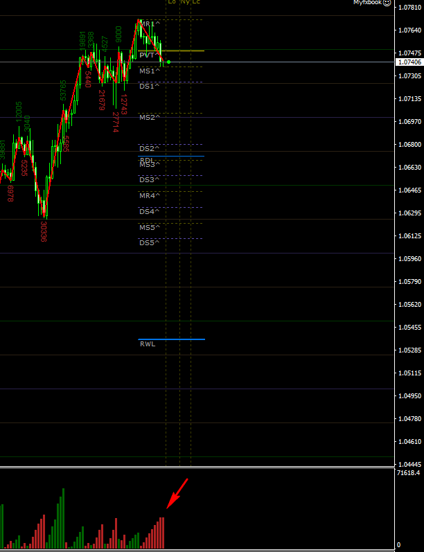 Après un pic aux alentours des 1.0775 lors de la session overnight, EURUSD effectue une correction ; les volumes d'offre sont bien visibles et la correction devrait se poursuivre tant qu'il n'y a pas d'arrivée significative de volume de demande ; surveiller cela.
