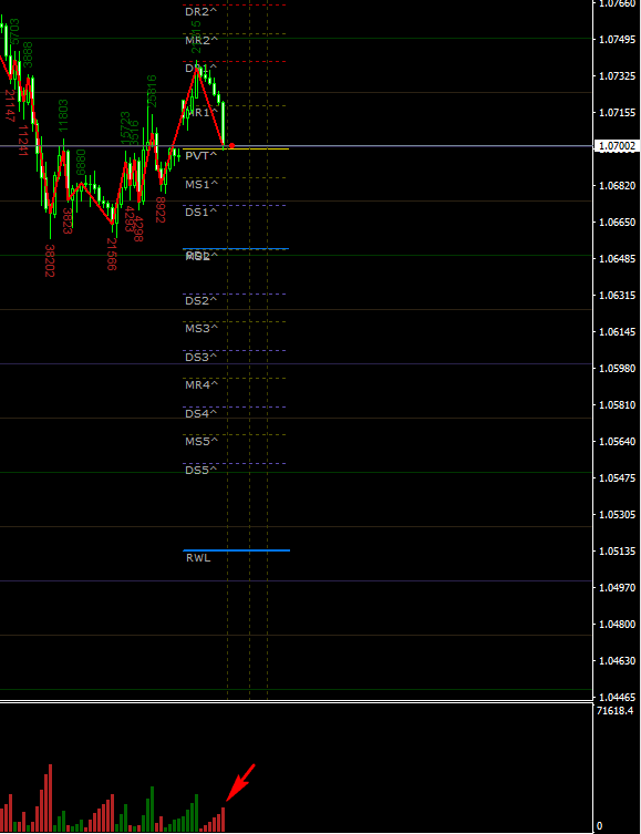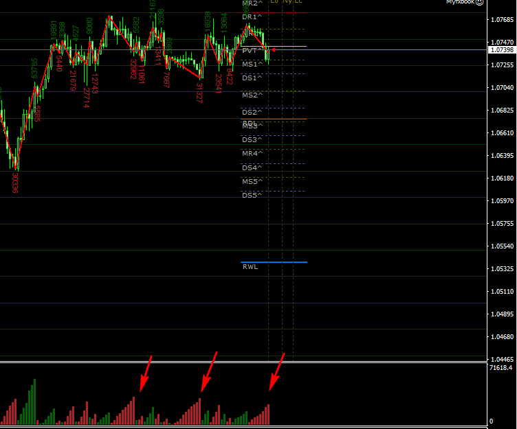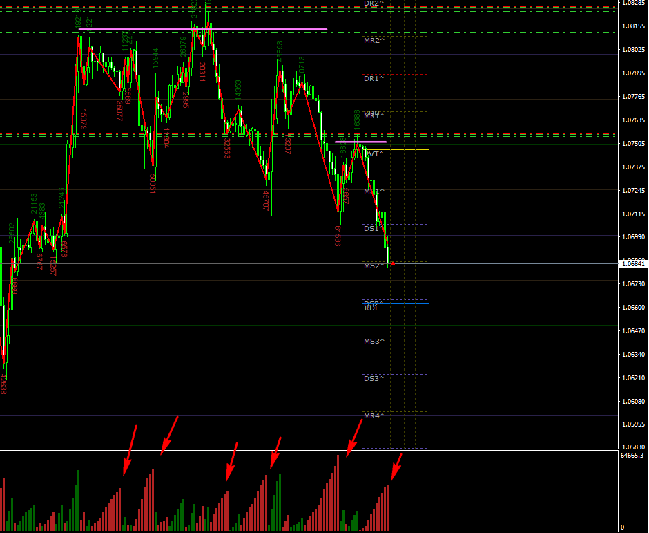 EURUSD se trouve actuellement sur les 1.0675, dans une configuration de rebond, après avoir testé (frôlé) trois fois 1.0650. Les volumes d'offre sont toujours bien présents et pour le moment pas de demande visible => la chute devrait se poursuivre vers les 1.06 dans ces conditions ; possibilité de re-teste des 1.07 ou de ranger un peu dans cette zone avant de continuer le plongeon ; il faudra surveiller les volumes de demande sur le rebond actuel pour voir si il ne se poursuit pas plus haut que 1.07.