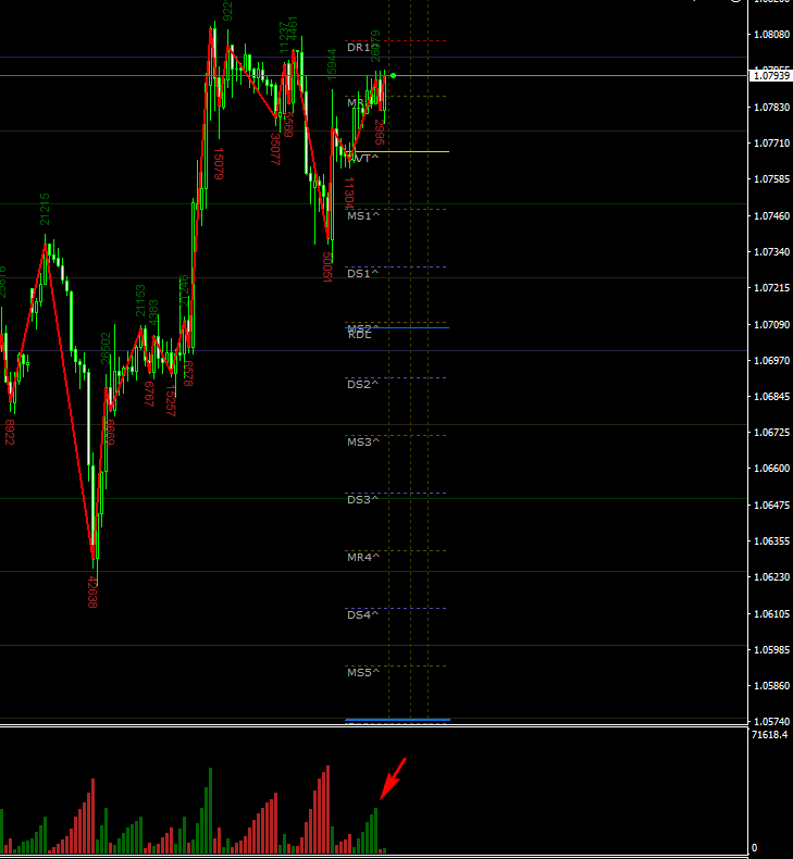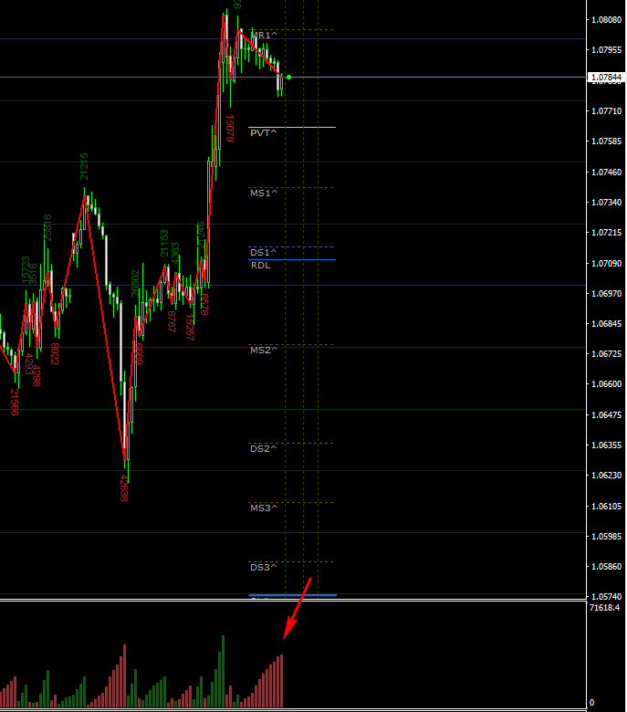 Après un rallye jusqu'aux 1.08, EURUSD se trouve à présent dans une configuration de correction ; les volumes d'offre sont importants, mais le cours ne chute pas lourdement => il y a encore beaucoup d'acheteurs ; vu les volumes, la paire pourrait corriger plus, peut-être vers les 1.0750 au moins, voire plus bas, après un (ou des) test des 1.08 ; surveiller si la demande n'arrive pas plus tôt, dès les 1.0775 (niveau actuel).