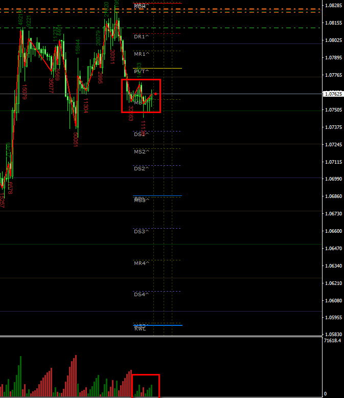 Hier EURUSD n'a pas réussi à dépasser de manière durable les 1.08 et a chuté lourdement pendant la session overnight, avec de bons volumes de vente ; ce matin, nous avons un début d'un petit trading range sur H1 (1.0750-1.0775), avec des volumes (assez faibles) qui suggère un rebond imminent. Il faudra surveiller les volumes d'offre pour anticiper le retour des vendeurs. Aujourd'hui vendredi, attention aux mouvements erratiques des pros qui clôturent la semaine.