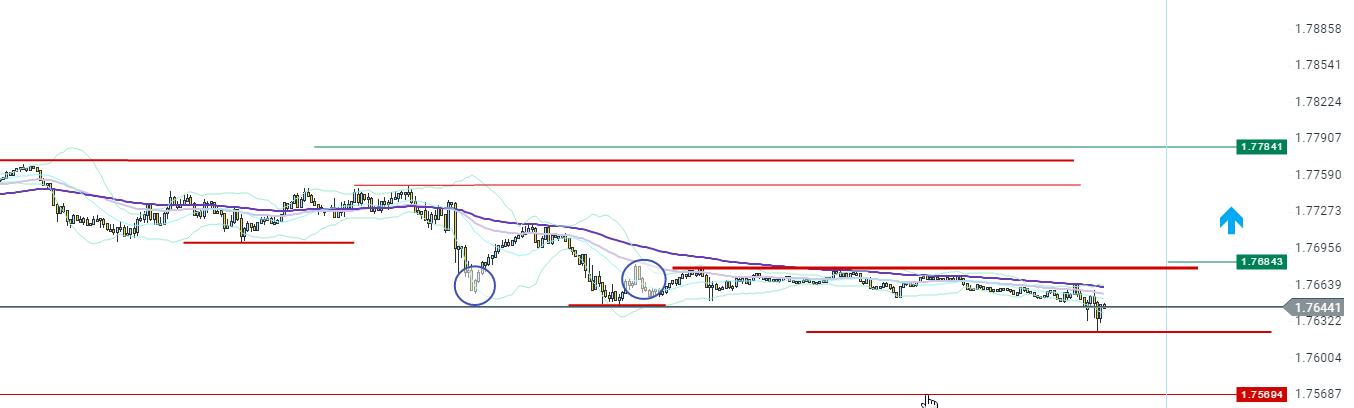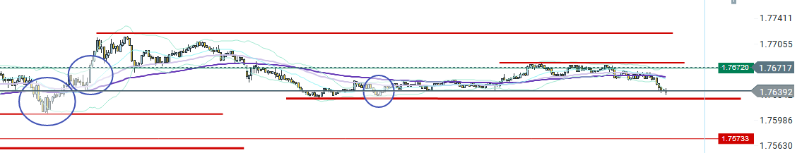 je suis donc descendu sur une UT M1 pour voir un peu l'orientation du cours, je vais considéré le niveau ... comme support sur cet UT, 1.76828, j'ai décidé de remonter mon stop loss au dessus de ma position étant donné que j'ai un volume 0.10 (qui est assez fort pour mon capital)