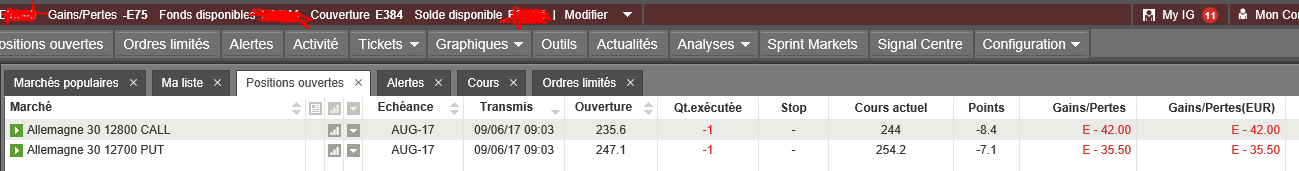 Si le DAX bouge de 100 points, sur une option seule, c'est une perte "potentielle" de 500€ (je simplifie le calcul) alors que chez IG, avec 10 contrats, vous aurez une perte "potentielle" de 5000€.