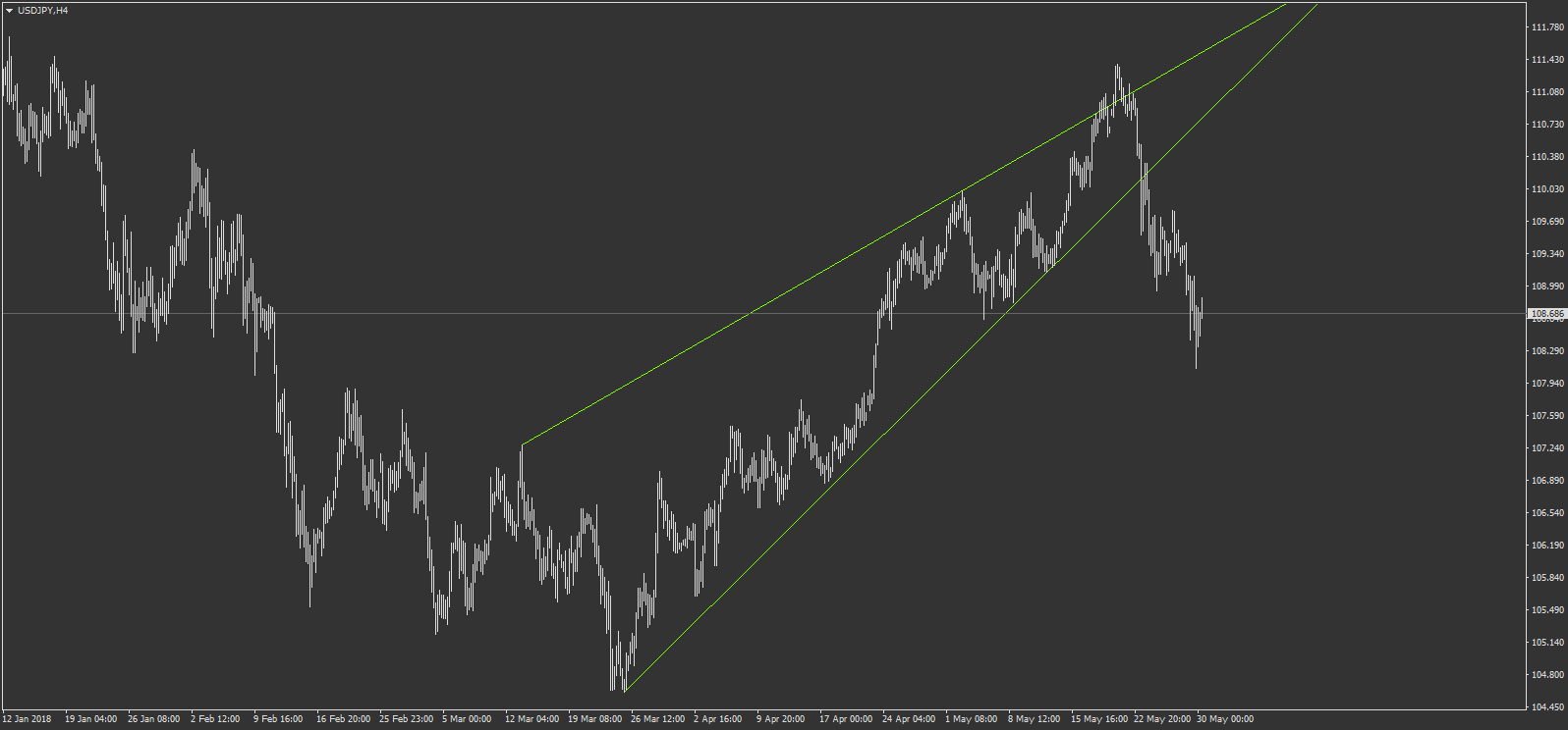 sur usdjpy, on a cassé un biseau à la baisse, et l'objectif c'est son plus bas. bien joué sur ce trade
