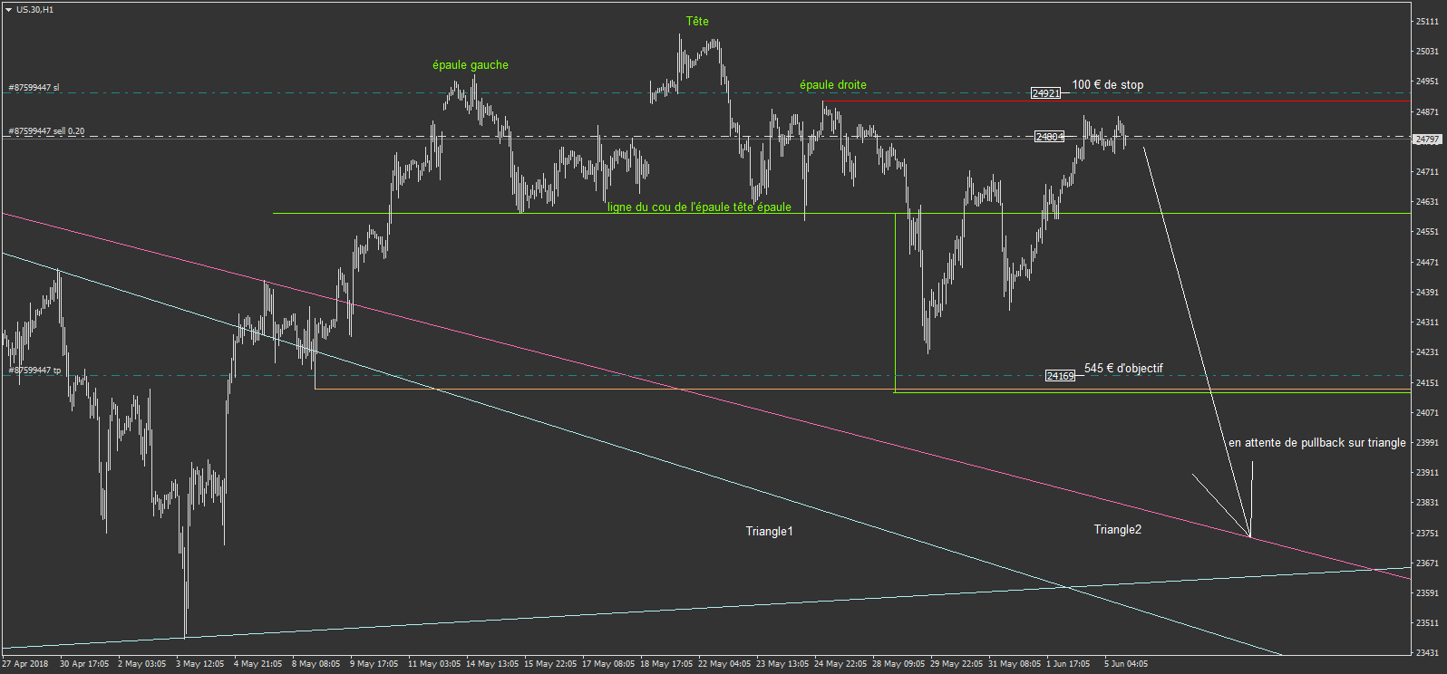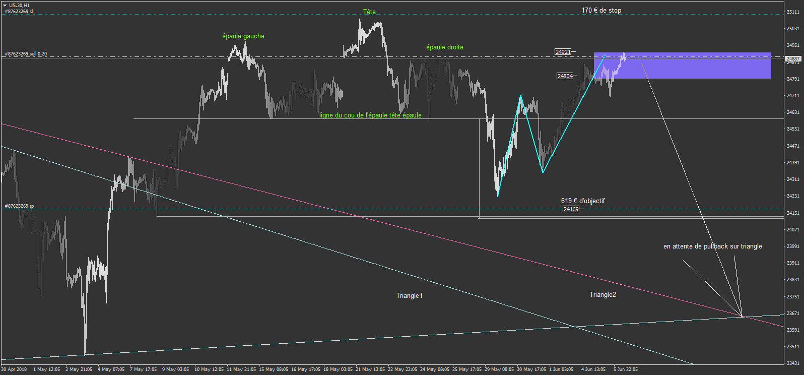 l'idée est la formation daily d'une grosse épaule tête épaule (ETE). enfin plutôt au moins de faire croire à cette formation, et donc le scénario de se trade consiste à profiter d'une partie de la baisse qui peut arrivé (ou non).
