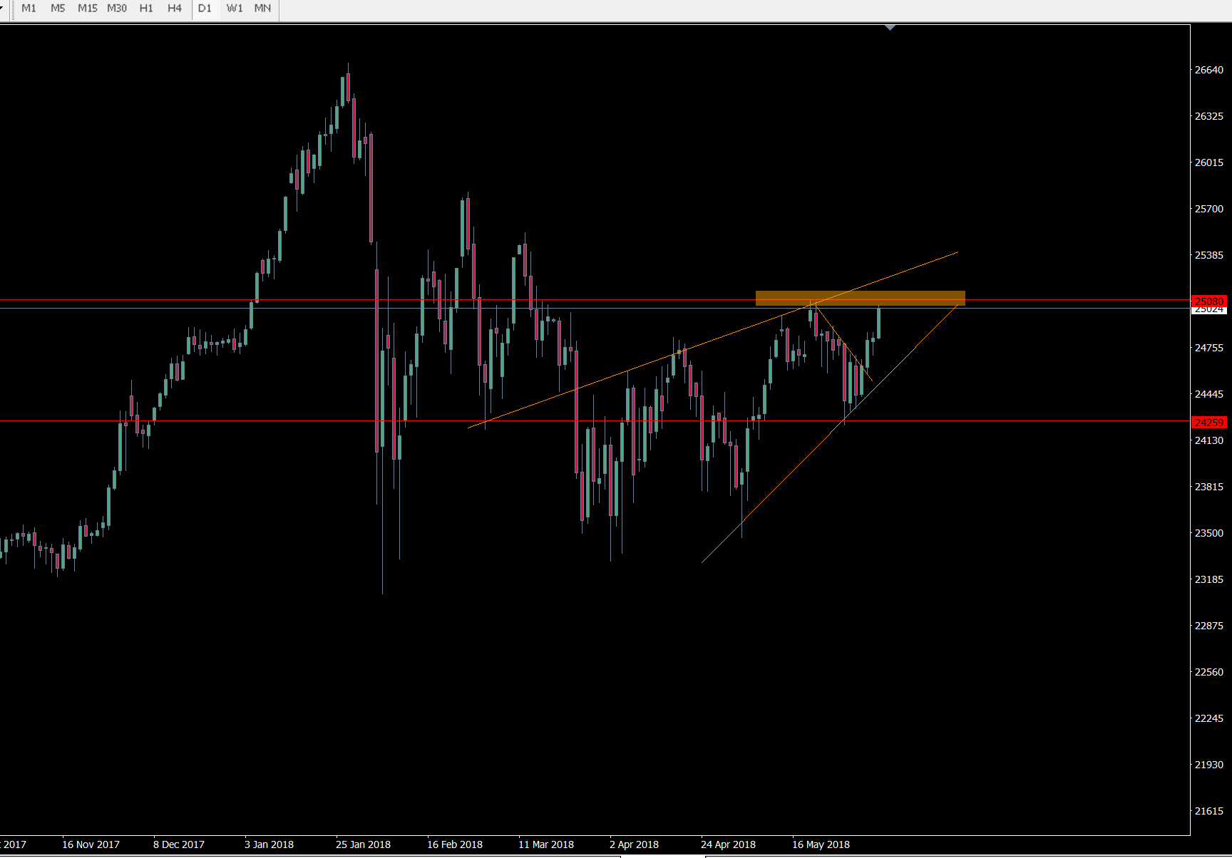 Sachant que sur cette indice on a cassé ce triangle vert assez gros, qui nous oriente théoriquement vers une hausse, alors attention!