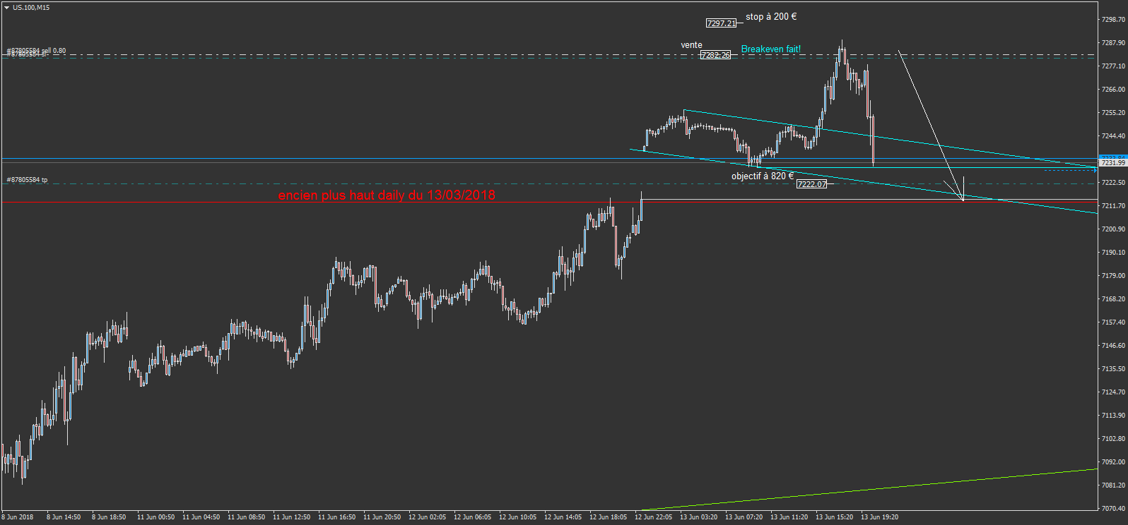 us.100 je viens de faire le breakeven en ramenant le stop à un niveau me permettant de ne plus rien risquer (sauf lors d'un gap intempestif!)