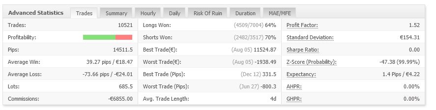 Enfin les stats, on y voit le nombre assez impressionnant de trades pris sur l'année (plus de 10000) soit une moyenne journalière de 40 trades.