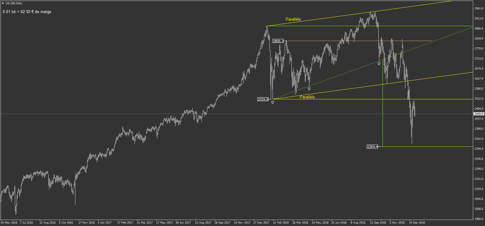 Mais sur US.500, on est pas passé loin sur le dernier plus bas. le US.30 a encore une bonne baisse théorique à attendre, mais un rebond n'est jamais impossible.
