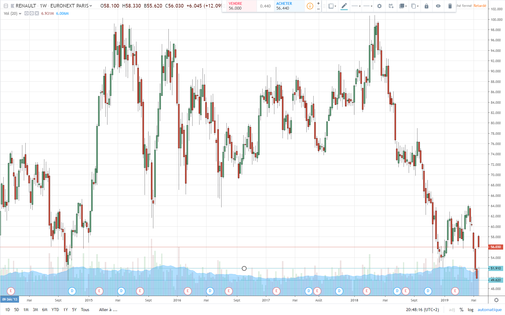 L'action Renault qui a fait l'actualité aujourd'hui me semble aussi intéressante d'un point de vue technique avec un niveau de support sur lequel on semble vouloir rebondir :Attention car c'est un dossier très fondamental, donc on peut avoir de gros mouvements liés à des actualités à venir.